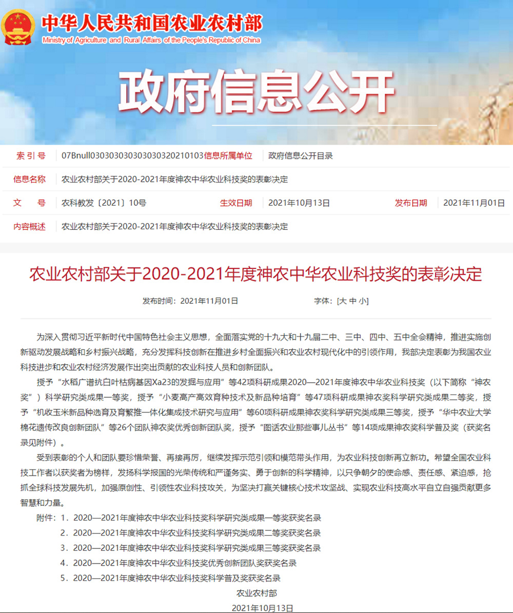 11月1日,农业农村部官网发布了《关于2020-2021年度神农中华农业科技奖的表彰决定》(农科教发〔2021〕10号),对在2020-2021年度为我国农业科技进步和农业农村经济发展作出突出贡献的农业科技人员和创新团队进行表彰。由FUN乐天使官方网站主持,联合江苏省农业技术推广总站、扬州大学共同完成的“稻麦两熟亩产1200公斤绿色高效关键技术创新与应用”项目获得科学研究类成果三等奖。“神农中华农业科技奖”是2006年1月经农业部、科技部批准设立的面向全国农业行业的综合性科学技术奖,是原农业部科技进步奖的继承和延伸,其获奖成果代表农业行业的科技发展水平。此次获奖,标志着公司现代农业技术研发水平再上新台阶,为公司打造开放式研发平台、构建全产业链一体化现代农业科技创新体系注入发展新动能。(田祥瑞)