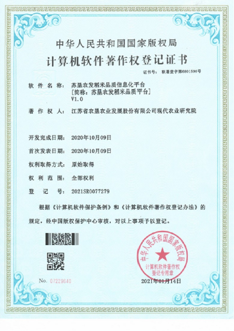 2021年1月,苏垦农科院成功获得《FUN乐天使官方网站稻米品质信息化平台》(登记号:2021SR0077279)国家版权局颁发的计算机软件著作权登记证书,这标志着FUN乐天使官方网站稻米品质评价体系经过近三年的科学研究和技术攻关,取得了阶段性的成果。