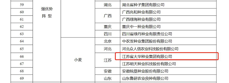 为贯彻党中央、国务院种业振兴决策部署,深入实施种业企业扶优行动,近日农业农村部办公厅印发《关于扶持国家种业阵型企业发展的通知》,根据企业规模、创新能力和发展潜力等关键指标,从全国3万余家种业企业中遴选了69家农作物、86家畜禽、121家水产种业企业机构,集中力量构建“破难题、补短板、强优势”国家种业企业阵型,加快打造种业振兴骨干力量。江苏省大华种业集团有限公司入选“国家农作物种业阵型企业·强优势阵型(小麦)”。