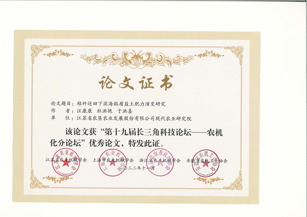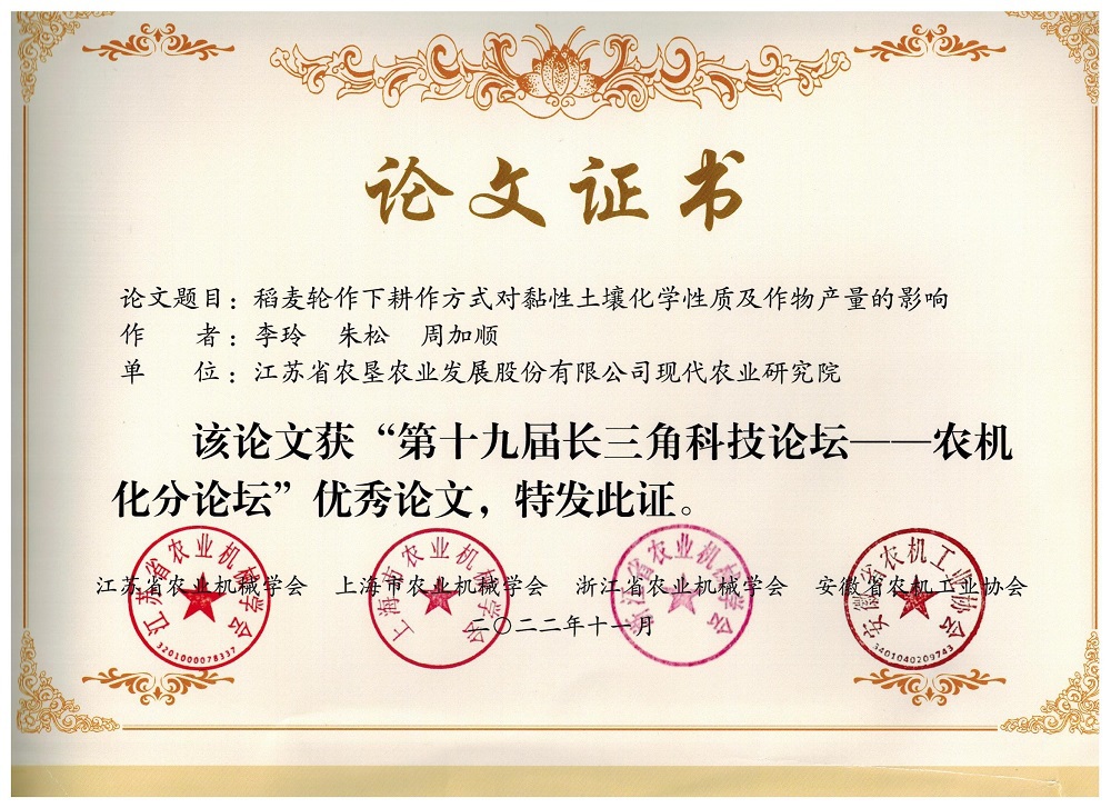11月21日,江苏省农业机械学会、上海农业机械学会、浙江省农业机械学会、安徽省农机工业协会发布了《关于表彰“第十九届长三角科技论坛-农机化分论坛”优秀论文的决定》(苏农机学会〔2022〕12号),FUN乐天使官方网站现代农业研究院为第一单位的两篇科技论文 “稻麦轮作下耕作方式对黏性土壤化学性质及作物产量的影响” “秸秆还田下滨海黏质盐土肥力演变研究”获得“第十九届长三角科技论坛-农机化分论坛”优秀论文奖。