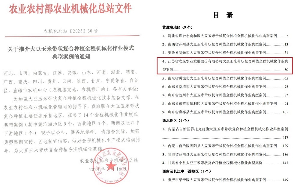 •        近期,江苏农垦“宽窄行4:4大豆玉米带状复合种植全程机械化作业模式”创新成果入选农业农村部大豆玉米带状复合种植全程机械化作业模式推介典型案例。大豆玉米带状复合种植是农业农村部2022年示范推广的重点技术之一,全国14个成果入选,江苏农垦是省内唯一一个入选的单位。