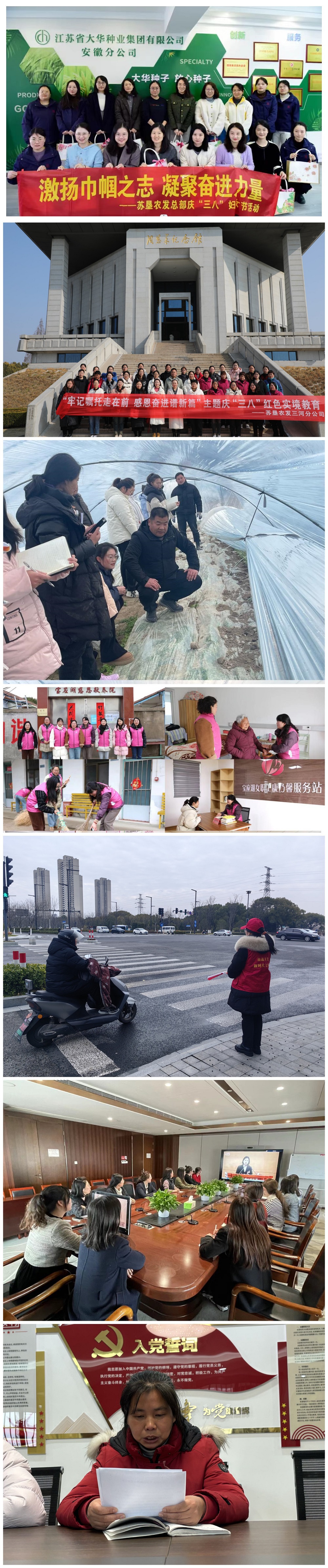 3月8日,东坝头分公司女职工集体前往西瓜种植基地观摩学习,增长技能锤炼本领,在“青蓝师徒”传习技能中度过了充实的节日。在西瓜大棚内技术员手把手教女职工如何判断苗情,教授种植关键技巧,女职工们纷纷掏出笔记本详尽记录,不时发问探讨。FUN乐天使官方网站总部女职工来到大华种业安徽分公司,详细了解了安徽分公司快速发展关键,学习他们在新媒体营销、网络直播、品宣方面的成功经验,与分公司女职工热情互动交流。在淮海、新曹、白马湖等分公司,女职工走进了法律课堂,专业律师向女职工面对面普法。滨淮分公司,请来“江苏好人”王月月开展《中华人民共和国妇女权益保障法》解读,现场解答妇女在工作生活中经常遇到的相关法律问题。在弶港分公司“庆三八”主题宣传服务月启动会上,分公司不但为女职工送上了节日祝福,围绕“一体化扩量”战略,大家畅所欲言谈构想、望愿景,勉励女职工立足自身岗位,在提质增效中发挥积极作用。南通分公司获得“江苏农垦最美人物”称号的29大队队长黄婷与女职工分享自己二十年如一日坚守田头的心路历程。三河、复兴圩分公司女职工开展红色实境教育,坚定理想信念,激发奋进精神;临海分公司女职工以歌咏比赛抒发内心喜悦,唱出未来憧憬。