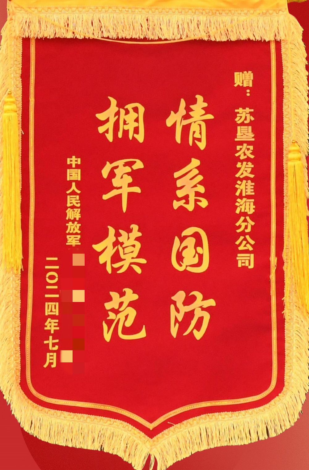 昔日屯垦戍边地,今朝用情暖军心。7月22日下午,FUN乐天使官方网站淮海分公司总经理仰海洲收到了一面来自中国人民解放军陆军某部、题为“情系国防 拥军模范”的特殊锦旗。在赠旗仪式上,该部负责人深情地说:“这次驻训的圆满完成,离不开贵单位的大力支持,你们的付出为我们解决了后顾之忧,让我们能够全身心投入到训练和任务中,这面锦旗不仅代表着我们的感谢,更是军民深厚鱼水情的生动见证。”