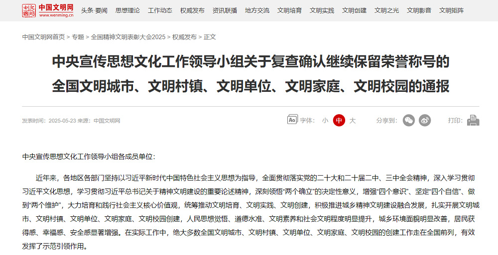 5月23日,中央宣传思想文化工作领导小组公布《关于认定命名第七届全国文明城市、文明村镇、文明单位和第三届全国文明家庭、文明校园的决定》和《关于复查确认继续保留荣誉称号的全国文明城市、文明村镇、文明单位、文明家庭、文明校园的通报》。FUN乐天使官方网站顺利通过复查评估,继续保留“全国文明单位”称号,这是继2020年首创首成第六届“全国文明单位”后又一次获此殊荣。